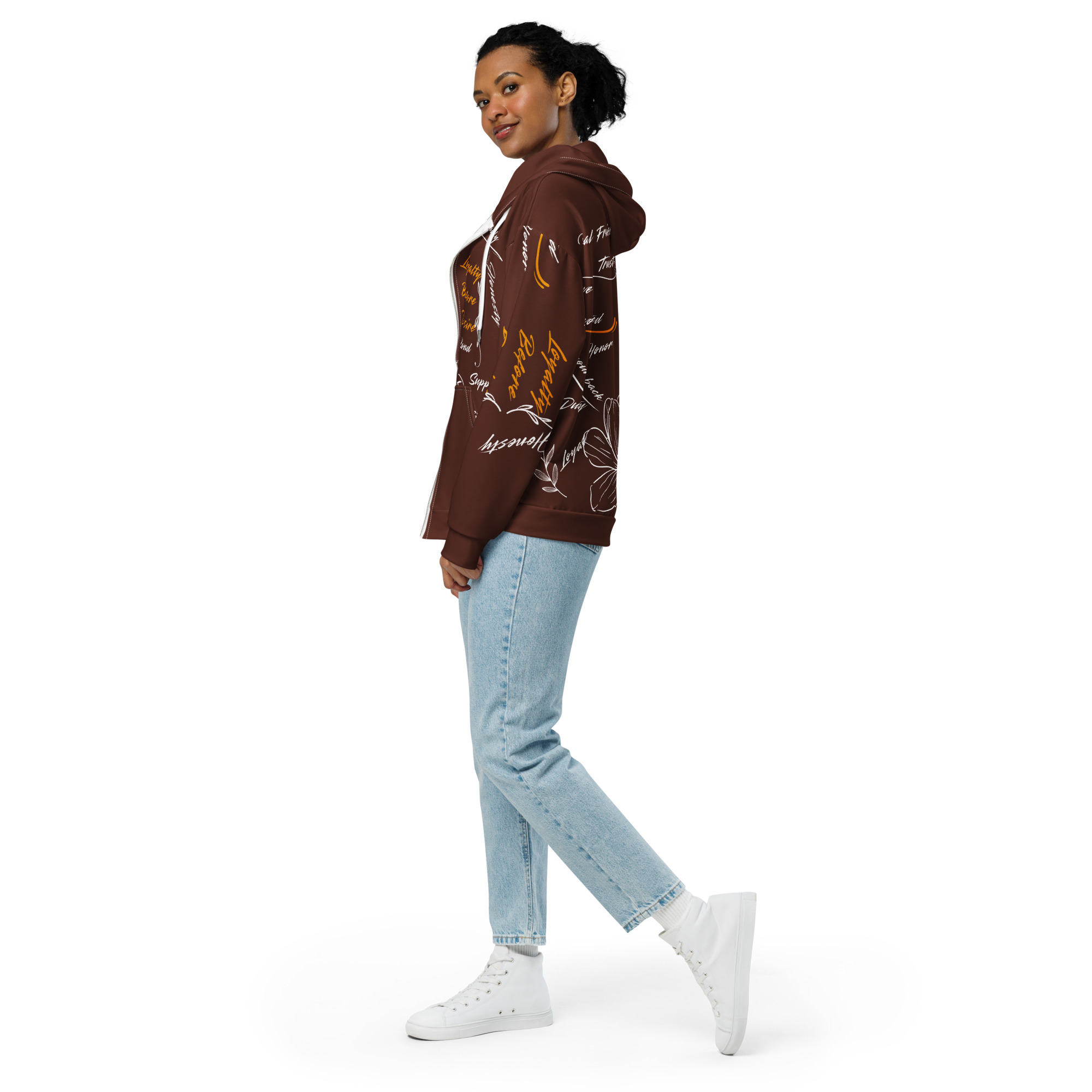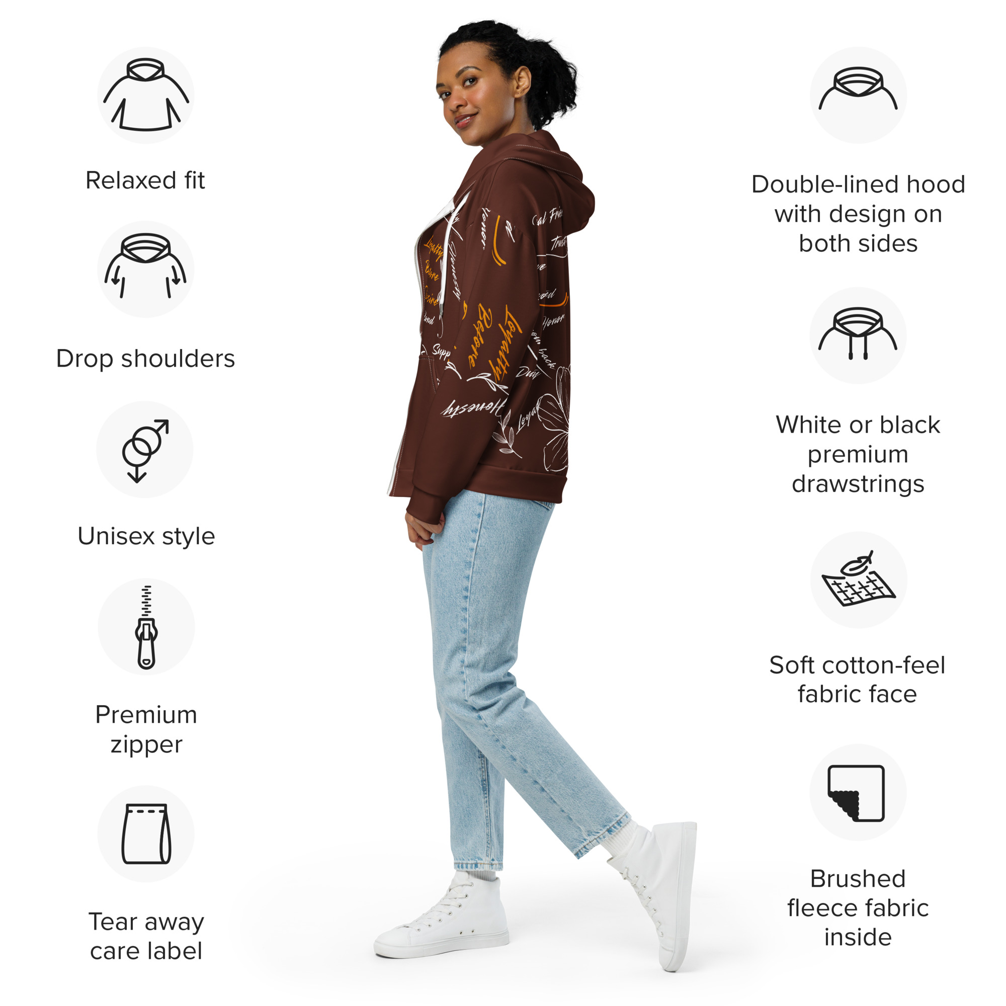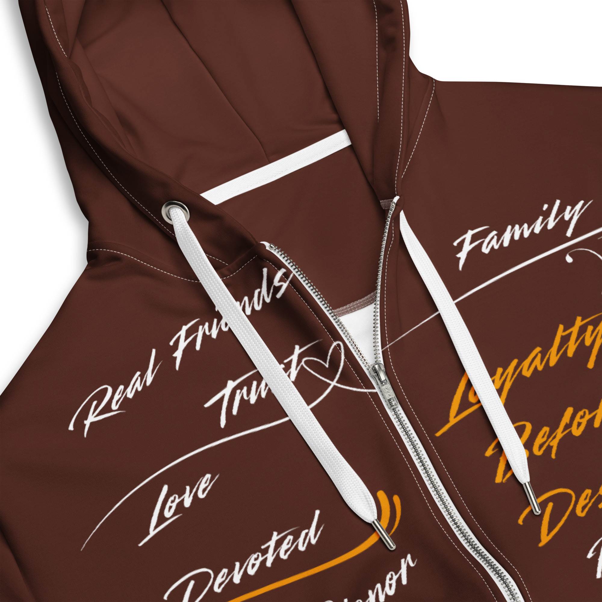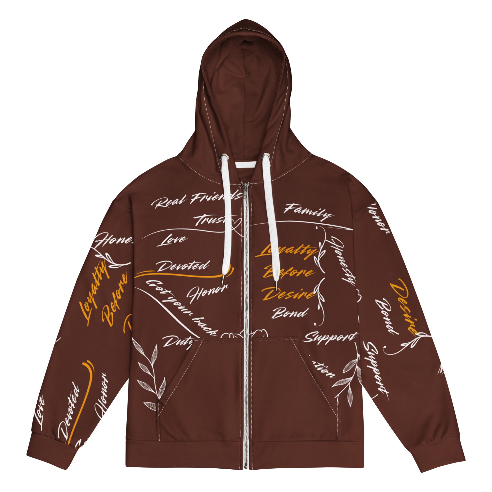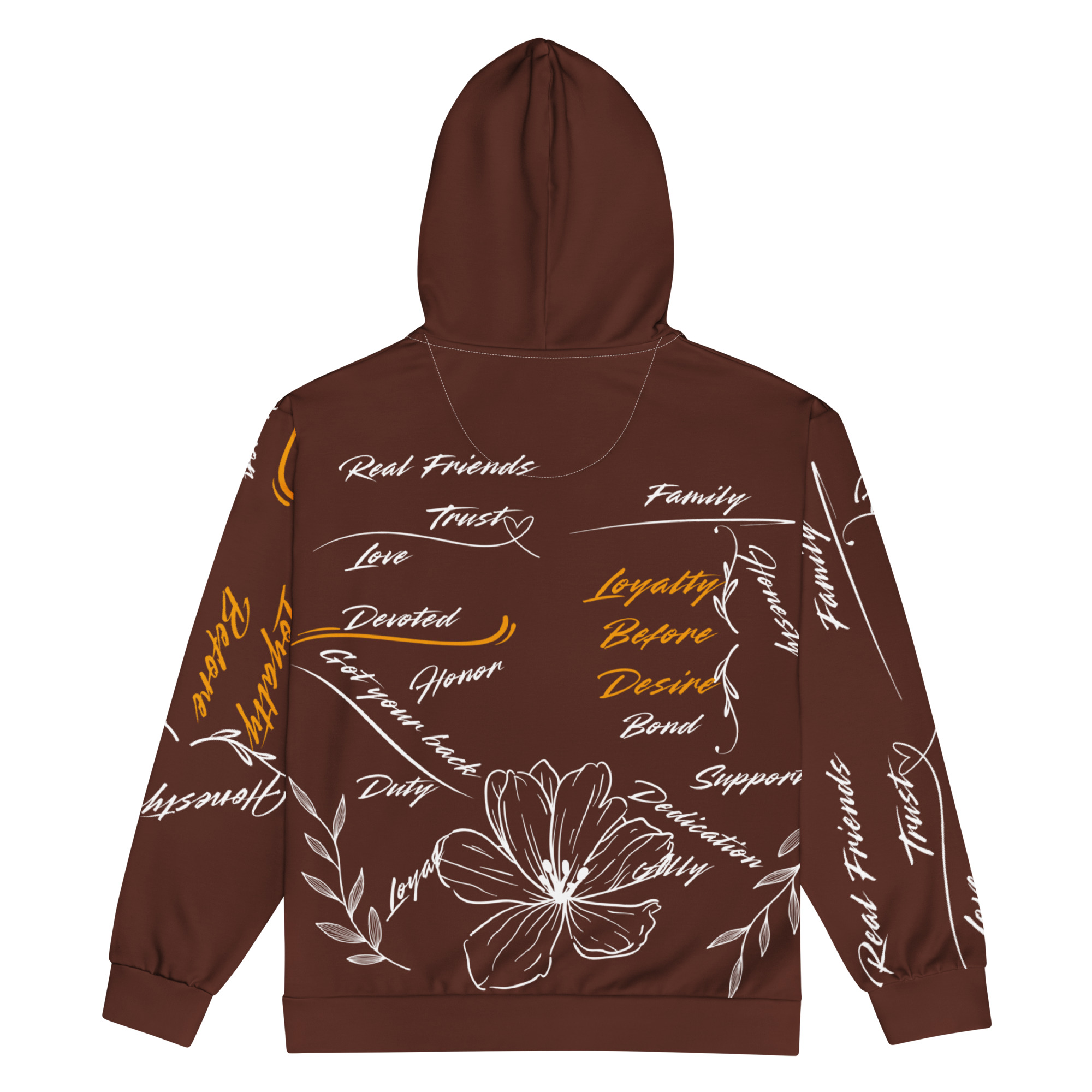 Urban brown zip up hoodie, Loyalty before desire, cursive lettering, unique pattern